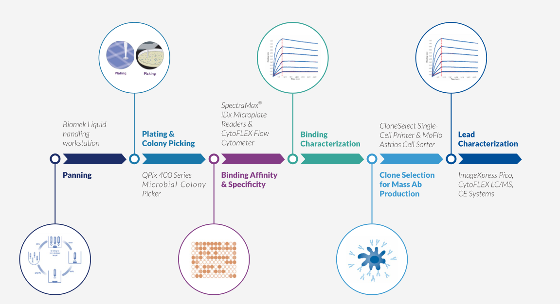 整体workflow大致分为6步(特异菌株淘选富集、单克隆菌株自动挑选、特异性筛选、 亲和力筛选、单克隆分选和进一步特性鉴定),提供自动化生物淘选、自动化大肠 杆菌克隆挑选代替手工挑取,可以在短时间内获得并处理大量大肠杆菌克隆,避免 丢失阳性克隆,并提供高通量、特异性、结合筛选和全方位鉴定抗体鉴定的一整套 解决方案,其中以Biomek液体处理自动化工作站、Qpix自动化微生物挑选系统、 SpectraMax 多功能酶标仪、BLI、SPR亲和力筛选系统和LC/MS、CE为主的生化、 物化表征鉴定系统为核心,可大大提高筛选到阳性候选先导抗体的效率和速度!